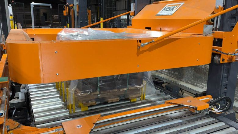 Dalším krokem je zakrytí palety smršťovacím obalem pomocí smršťovacího zařízení MSK Multitech, které zvládne zabalit až 140 palet za hodinu.