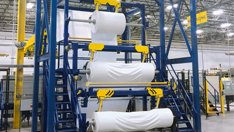 Stroj zpracovává až šest různých formátů fólie plně automaticky. Fóliové role jsou aktivně poháněny a lze je rychle a snadno vyměnit bez nutnosti vstupu do bezpečnostní zóny. Svařovací zařízení zajišťuje optimální spojení staré a nové fólie.