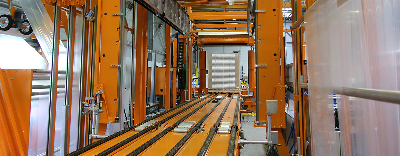 Combined with fully automatic fully automatic palletizing and packaging systems MSK pallet conveyors work as an integrated transport system, controlled by the MSK software EMSY. Especially in the case of transportation to packaging systems the precise positioning of the conveyed goods can be cost saving because the packaging film size can be minimized.