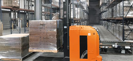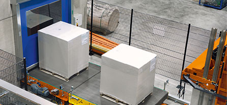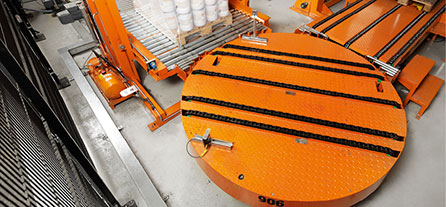 Combined with fully automatic fully automatic palletizing and packaging systems MSK pallet conveyors work as an integrated transport system, controlled by the MSK software EMSY. Especially in the case of transportation to packaging systems the precise positioning of the conveyed goods can be cost saving because the packaging film size can be minimized.