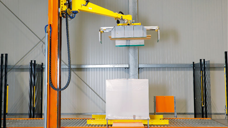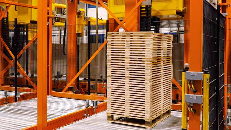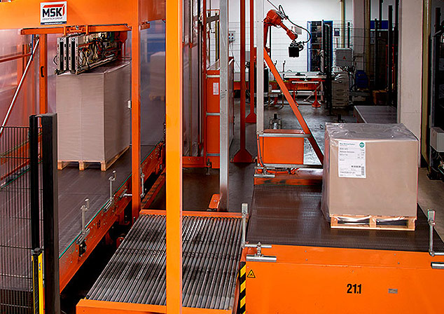 In combination with fully automatic packaging systems stationary and mobile pallet conveyors and pallet elevators work in the entire area of end-of-line packaging. The use of the software EMSY means that production data accompanies the products on the pallets to the warehouse.