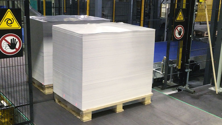 The separation of paper pallets after the sheeter is achieved by MSK through a special transition between conveyor belt segments. The slight difference in speed of the second segment allows the paper stacks to be separated.
