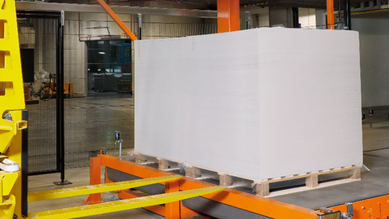 Developed specifically for the paper and cardboard industry, an MSK portal system downstream from the sheeter separates the pallets by taking each individually and transferring it to a pallet conveyor. On the pallet conveyor the pallets are positioned in either a lengthwise or crosswise transport direction.