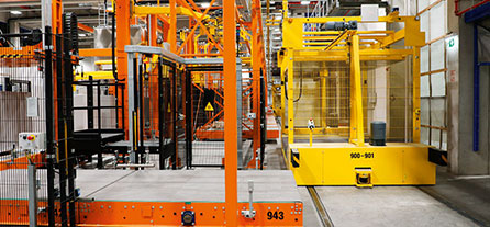 For different pallet conveyor lines, depending on the production performance, flexible connecting to each other, and, if required, conveyance through several halls or floors, MSK uses fully automated mobile pallet transport systems: